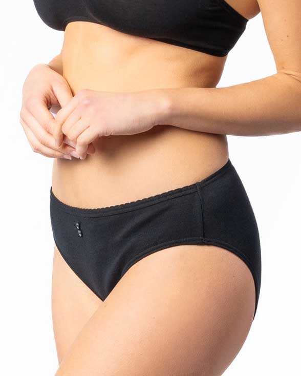 Svart 2 pakning truser fra Living Crafts i 100 % økologisk bomull. Pen heklet kant og 2 perlemors knapper til pynt.