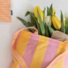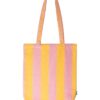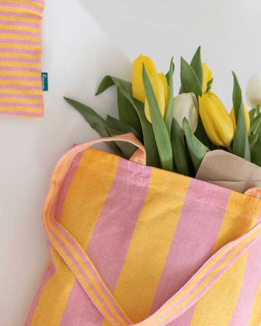 Handlenett i tøy med brede gule og rosa striper.