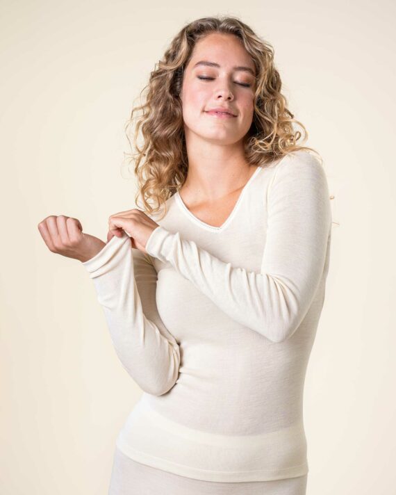 Naturhvit ulltrøye i 70 % økologisk ull og 30% silke
