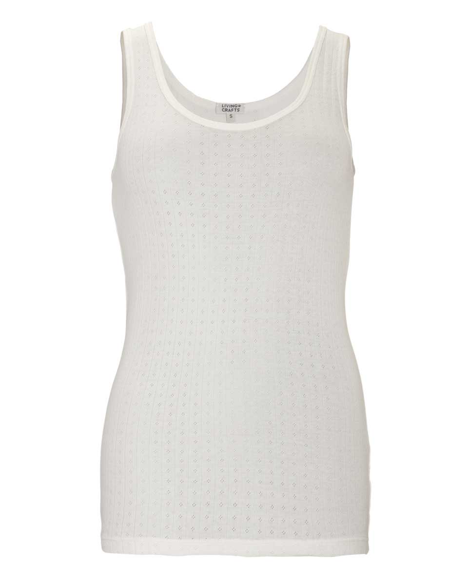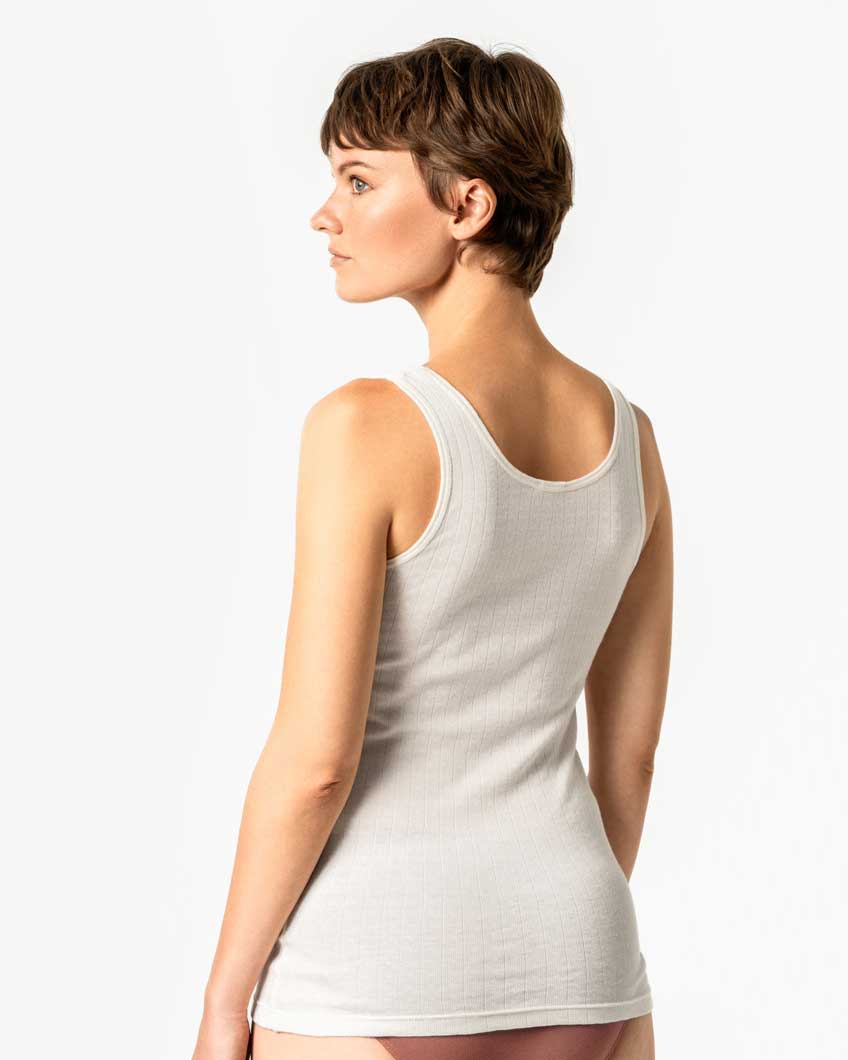 Kremhvit singlet 100 % økologisk bomull. Pointelle-mønsteret, eller også kalt jacquard, gjør disse ekstra behagelig og luftig og gir det lille ekstra.