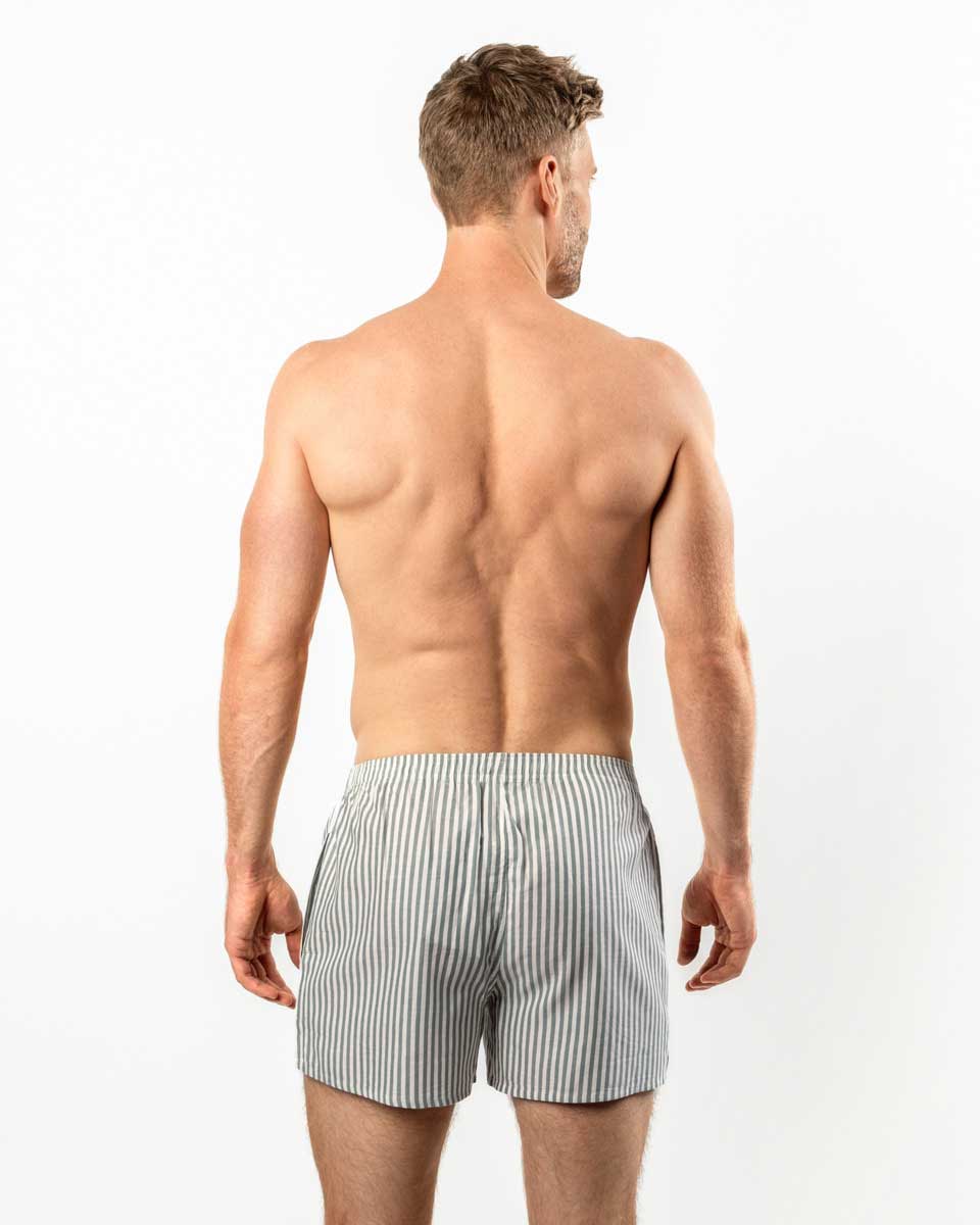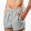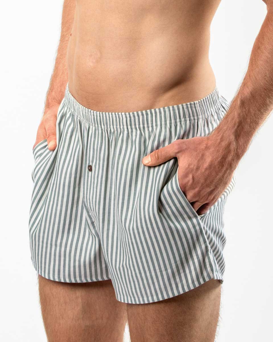 Løs boxer med striper fra Living Crafts.. Boxeren har loddrette grønne striper, gylf med knapp og til og med lommer.