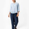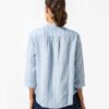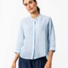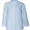 Behagelig og elegant linbluse med skjulte corozo knapper og 3/4 dels ermer. Nydelig lyseblå farge med hvite loddrette striper.
