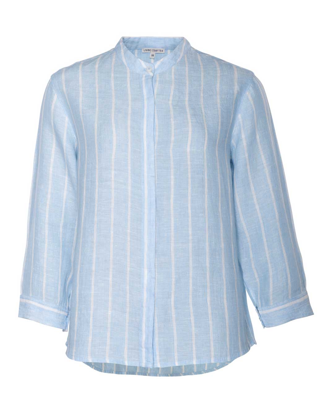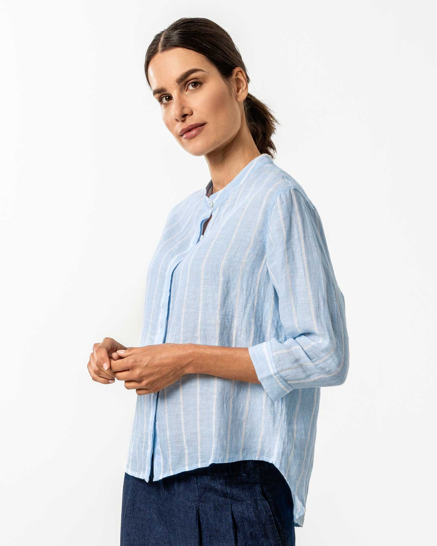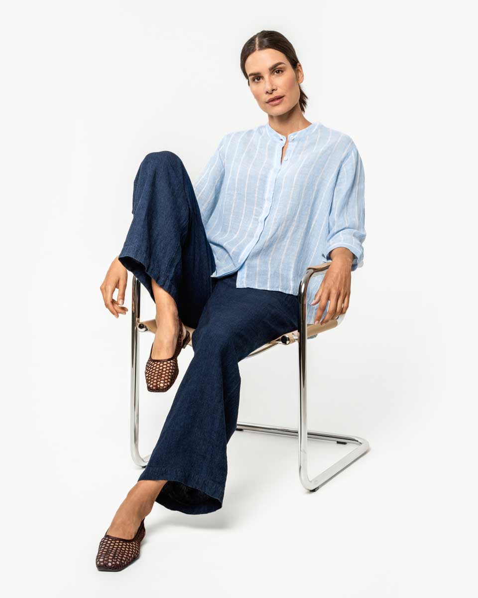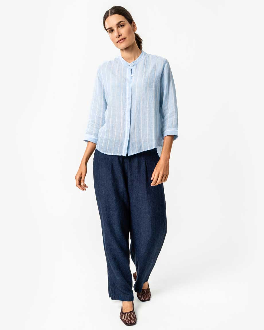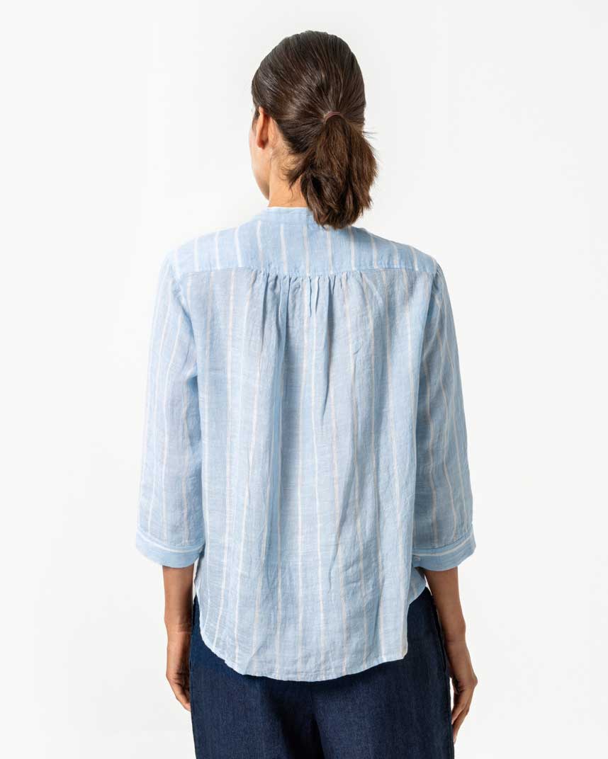 Behagelig og elegant linbluse med skjulte corozo knapper og 3/4 dels ermer. Nydelig lyseblå farge med hvite loddrette striper.
