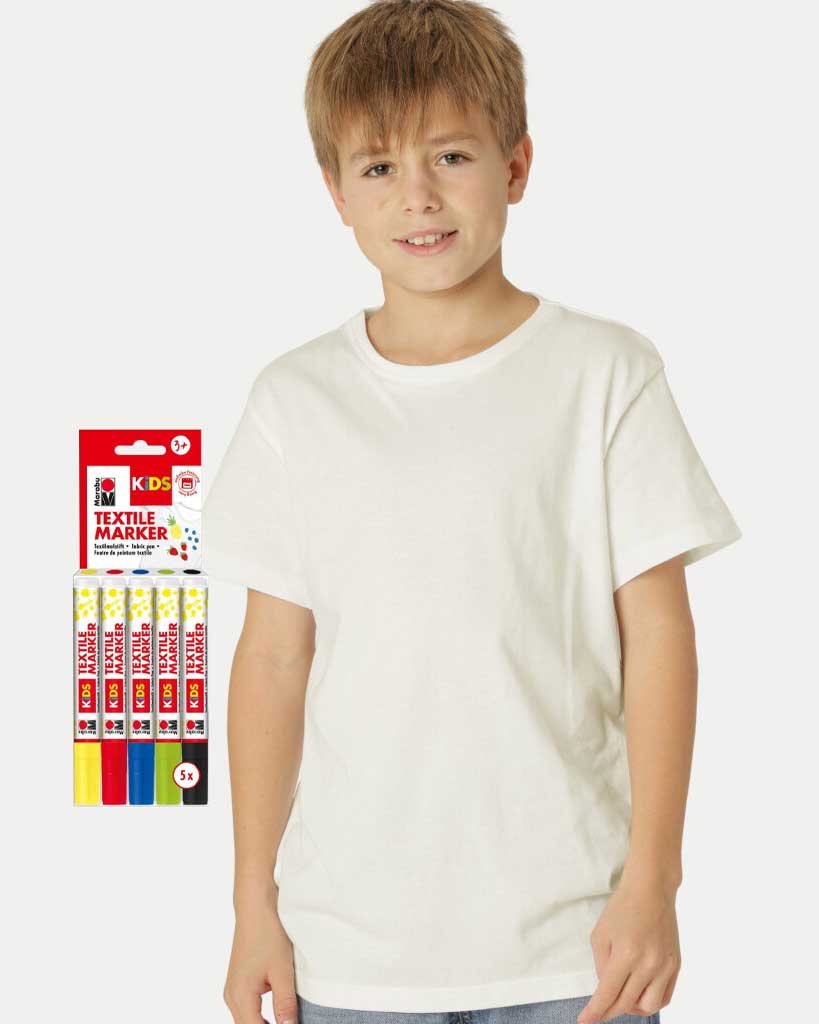 Sett med 1 naturhvit t-skjorte til barn og 5 pakning tekstiltusjer.