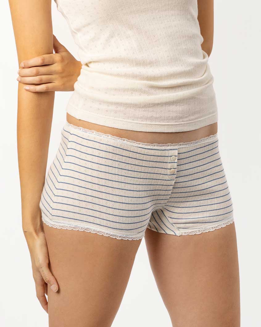 Plastfri dameboxer i 100 % økologisk bomull. Pointelle-mønsteret, eller også kalt jacquard, gjør disse ekstra behagelig og luftig og gir det lille ekstra. Boxeren er naturhvit med blå striper og har to knapper til pynt foran.