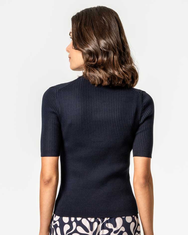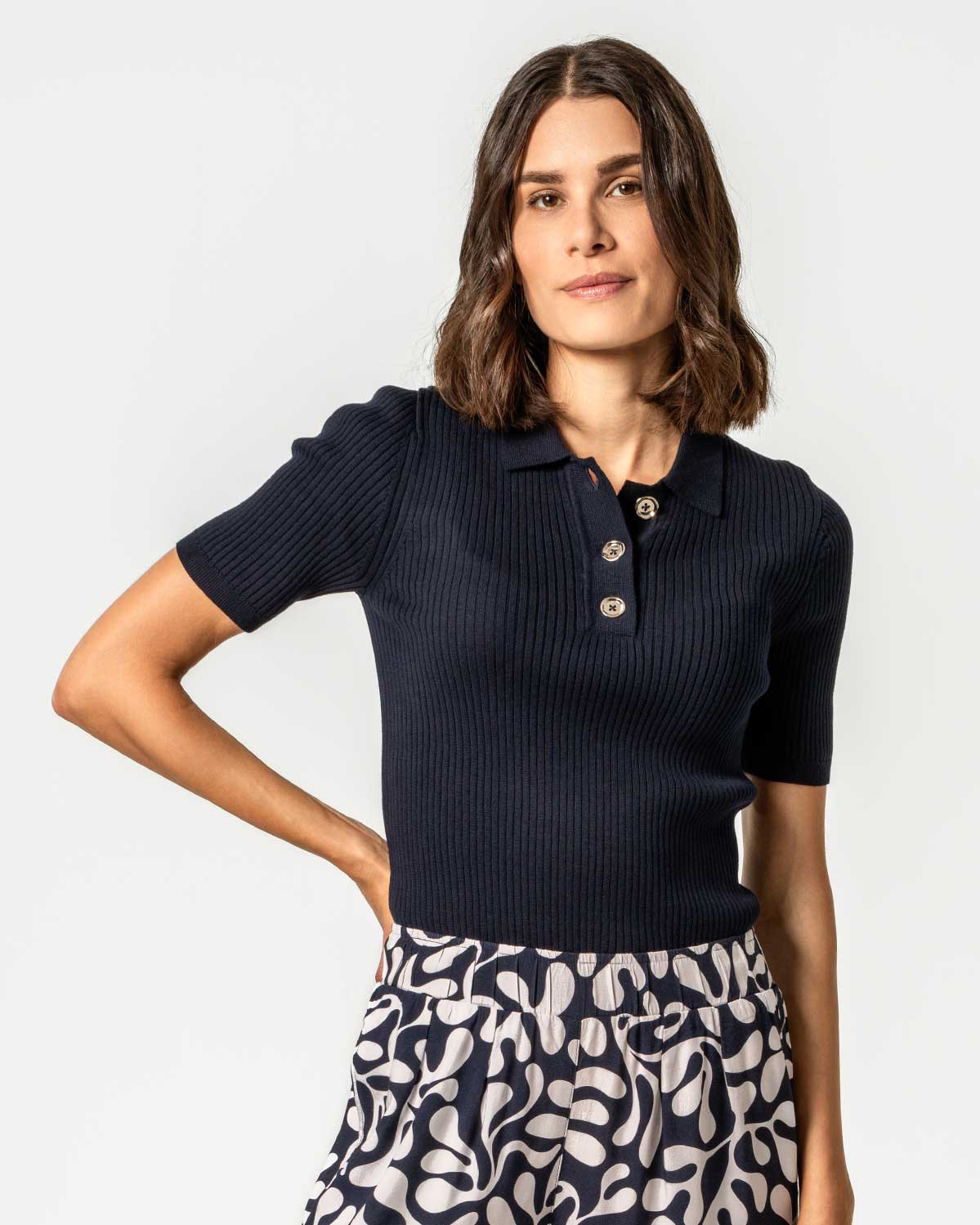 Ribbestrikket topp med knapper og krage – mørkeblå