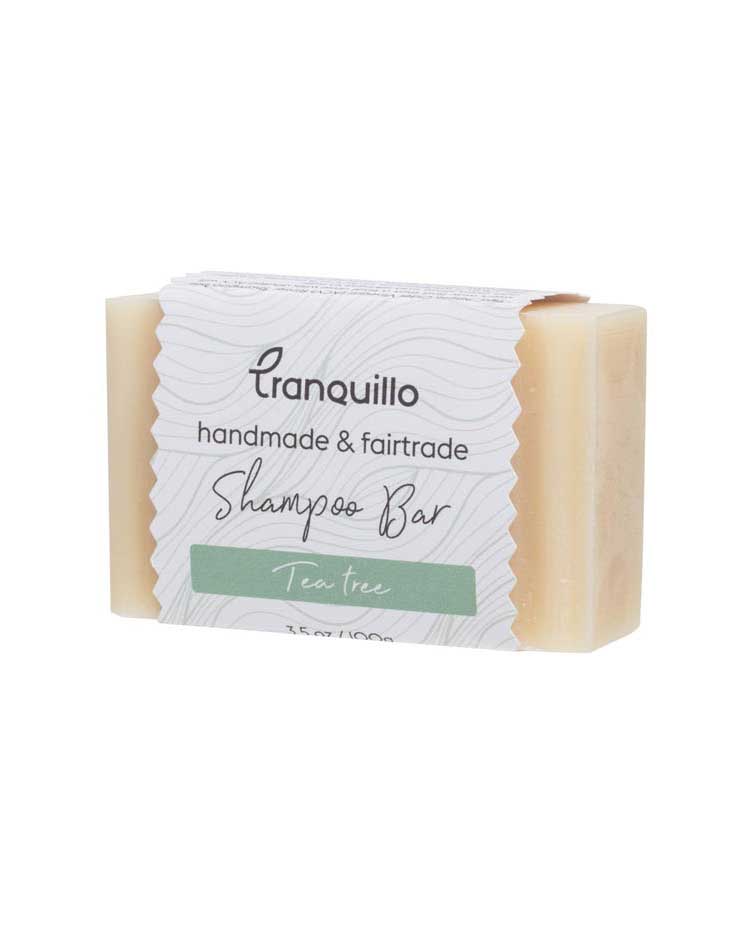 Plantebasert vegansk sjampobar fra Tranquillo med Tea Tree. Såpen er håndlaget, Fairtrade, vegansk og laget av medlemmer av World Fair Organization. Gni såpen mellom hendene til det skummer og masser inn i hodebunnen. Skyll godt.